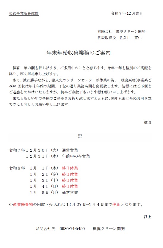 さて、誠に勝手ながら、搬入先のクリーンセンターが休業の為、一般廃棄物(事業系ごみ)の回収は年末年始の期間、下記の通り業務時間を変更致します。皆様にはご不便とご迷惑をおかけいたしますが、何卒ご容赦下さいます様お願い申し上げます。